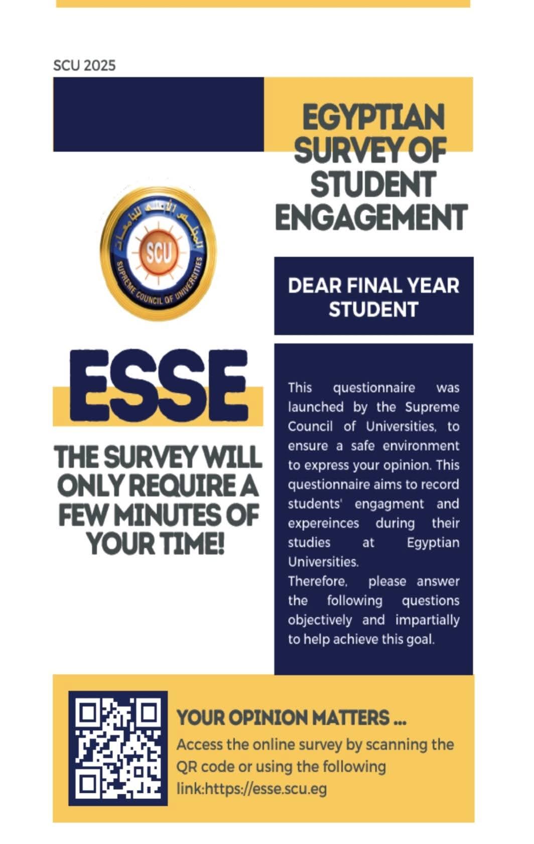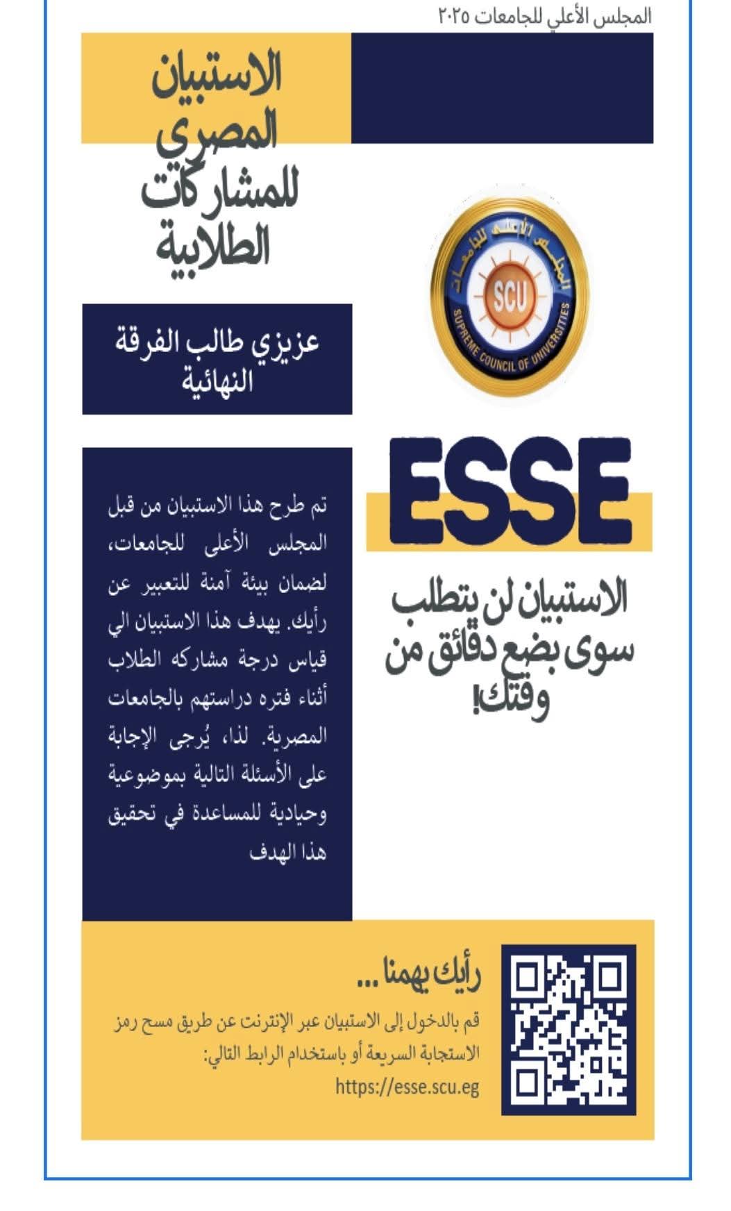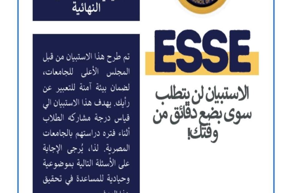 تحت رعاية السيد الأستاذ الدكتور/ محمد أيمن عاشور وزير التعليم العالي والبحث العلمي، وفي ضوء توجيهات السيد أ.د/ مصطفي رفعت أمين المجلس الأعلى للجامعات للعمل على تحقيق رؤية مصر 2030 بتطوير التعليم الجامعي ورفع التصنيف الدولي والوصول الي الهدف الرابع من أهداف التنمية المستدامة لضمان تعليم جيد ومنصف وشامل وتعزيز فرص التعلم ، يُعلن المجلس الأعلى للجامعات عن إطلاق الإصدار الثاني من الاستبيان المصري للمشاركات الطلابية بالجامعات المصرية (ESSE) والذي يستهدف طلاب الفرق النهائية للعام الأكاديمي 2024/2025 بالجامعات المصرية.