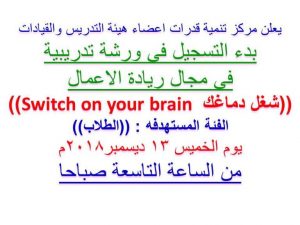 بناءا على موافقة السيد الاستاذ الدكتور / احمد عزيز – رئيس الجامعة على إقامة دورة تدريبية ورش عمل للطلاب فى مجال ريادة الاعمال، يقوم مركز تنمية قدرات اعضاء هيئة التدريس والقيادات الجامعية بعمل ورشة تدريبية فى مجال ريادة الاعمال ((شغل دماغك Switch on your brain)) لرفع مهارات الطلاب فى مجال ريادة الاعمال يوم الخميس 13 ديسمبر 2018م من 9 صباحا وحتى 3 عصرا للطلاب مع العلم ان العدد محدود وتكلفة الورشة خمسون جنيها (شاملة التدريب + بريك + شهادة) للاستفسار والحجز للحجز بمركز تنمية قدرات اعضاء هئية التدريس والقيادات الجامعية – الدور الاول – اسفل المدرجات المركزية.