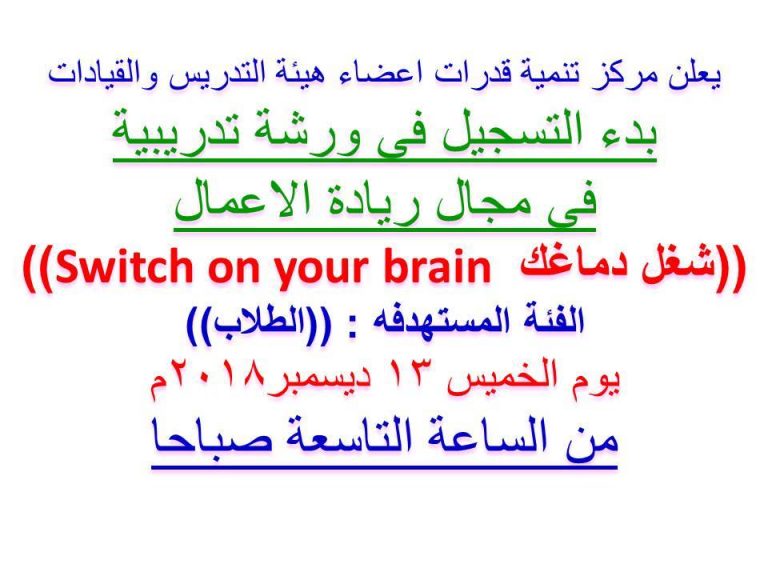بناءا على موافقة السيد الاستاذ الدكتور / احمد عزيز – رئيس الجامعة على إقامة دورة تدريبية ورش عمل للطلاب فى مجال ريادة الاعمال، يقوم مركز تنمية قدرات اعضاء هيئة التدريس والقيادات الجامعية بعمل ورشة تدريبية فى مجال ريادة الاعمال ((شغل دماغك Switch on your brain)) لرفع مهارات الطلاب فى مجال ريادة الاعمال يوم الخميس 13 ديسمبر 2018م من 9 صباحا وحتى 3 عصرا للطلاب مع العلم ان العدد محدود وتكلفة الورشة خمسون جنيها (شاملة التدريب + بريك + شهادة) للاستفسار والحجز للحجز بمركز تنمية قدرات اعضاء هئية التدريس والقيادات الجامعية – الدور الاول – اسفل المدرجات المركزية.