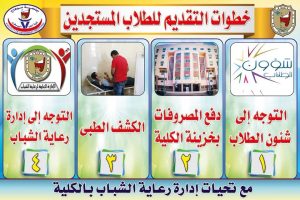 استعدادات لإستقبال الطلاب والطالبات المتقدمين والمتقدمات للالتحاق بالكلية وخطوات التقديم كما تظهر في الصورة المرفقة: