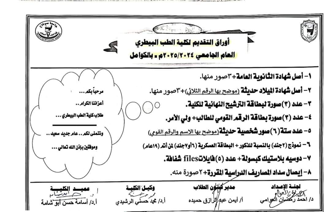 اعلان هام للطلاب المرشحين للقبول بكلية الطب البيطرى جامعة سوهاج