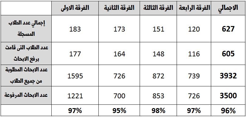 انتهت كليه الطب البيطري من اتمام رفع الابحاث الخاصه بطلابها هكذا صرح الاستاذ الدكتور بهاء الدين علي عبداللاه عميد الكليه حيث بلغ عدد الطلاب الذين اتموا رفع الابحاث 605 طالب بواقع 3500 بحث و قد بلغت نسبه رفع الابحاث للفرق الاربع حوالي 96% و تعد كليه الطب البيطري من اعلي نسب اتمام رفع الابحاث علي المنصه الالكترونيه الخاصه برفع الابحاث ايضا كما اوضع سيادته بان الطلاب الذين لم تتح لهم الفرصه لرفع الابحاث في الموعد المحدد سوف يتم فتح التسجيل و رفع الابحاث مره اخري يوم 5/7/2020 حتي يتسني لهم اتمام التسجيل و رفع الابحاث