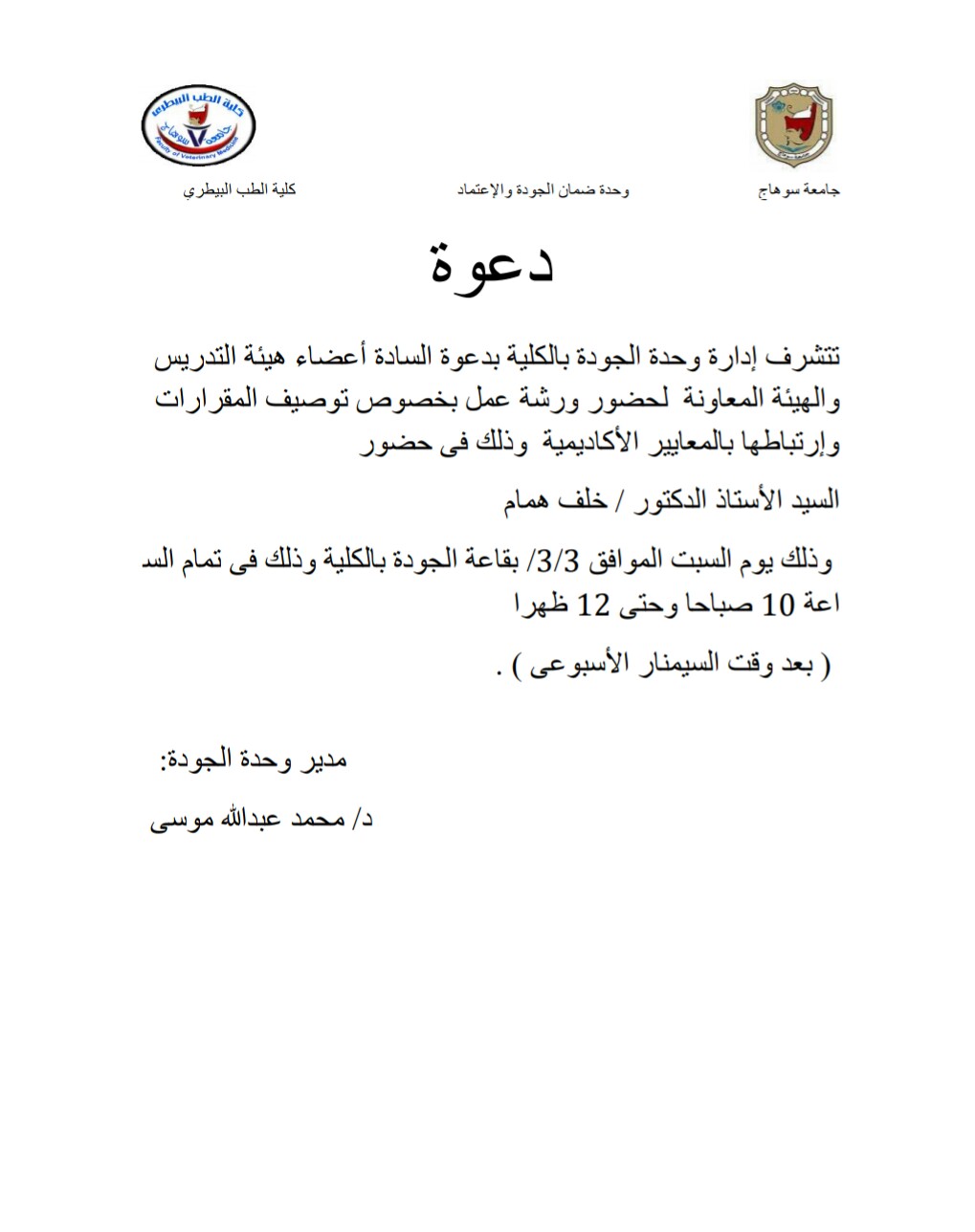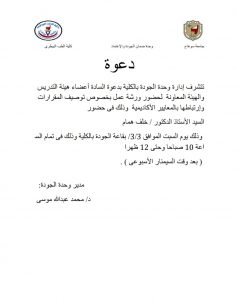 الرئيسية » دعوة وحدة ضمان الجودة لورشة عمل بخصوص توصيف المقرارات و ارتباطها بالمعايير الاكاديميةدعوة وحدة ضمان الجودة لورشة عمل بخصوص توصيف المقرارات و ارتباطها بالمعايير الاكاديميةبواسطة manar