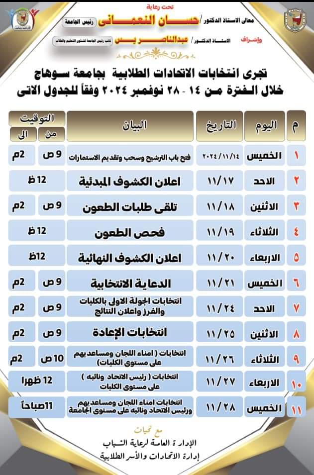 أعلن الدكتور حسان النعماني رئيس جامعة سوهاج، الجدول الزمني لانطلاق انتخابات الاتحادات الطلابية بالجامعات للعام الدراسي 2024/2025، والمُعتمد من الدكتور أيمن عاشور وزير التعليم العالي والبحث العلمي.