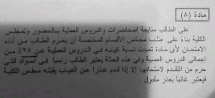 الرئيسية » لائحه الطلاب بالكليه يحرم الطالب من أداء الامتحان لأي ماده تعدت نسبه غيابه ٢٥% من إجمالي الدروس العمليه..لائحه الطلاب بالكليه يحرم الطالب من أداء الامتحان لأي ماده تعدت نسبه غيابه ٢٥% من إجمالي الدروس العمليه..بواسطة manarتنبيه هام بناء علي الماده رقم ٨ من لائحه الطلاب بالكليه يحرم الطالب من أداء الامتحان لأي ماده تعدت نسبه غيابه ٢٥% من إجمالي الدروس العمليه..
