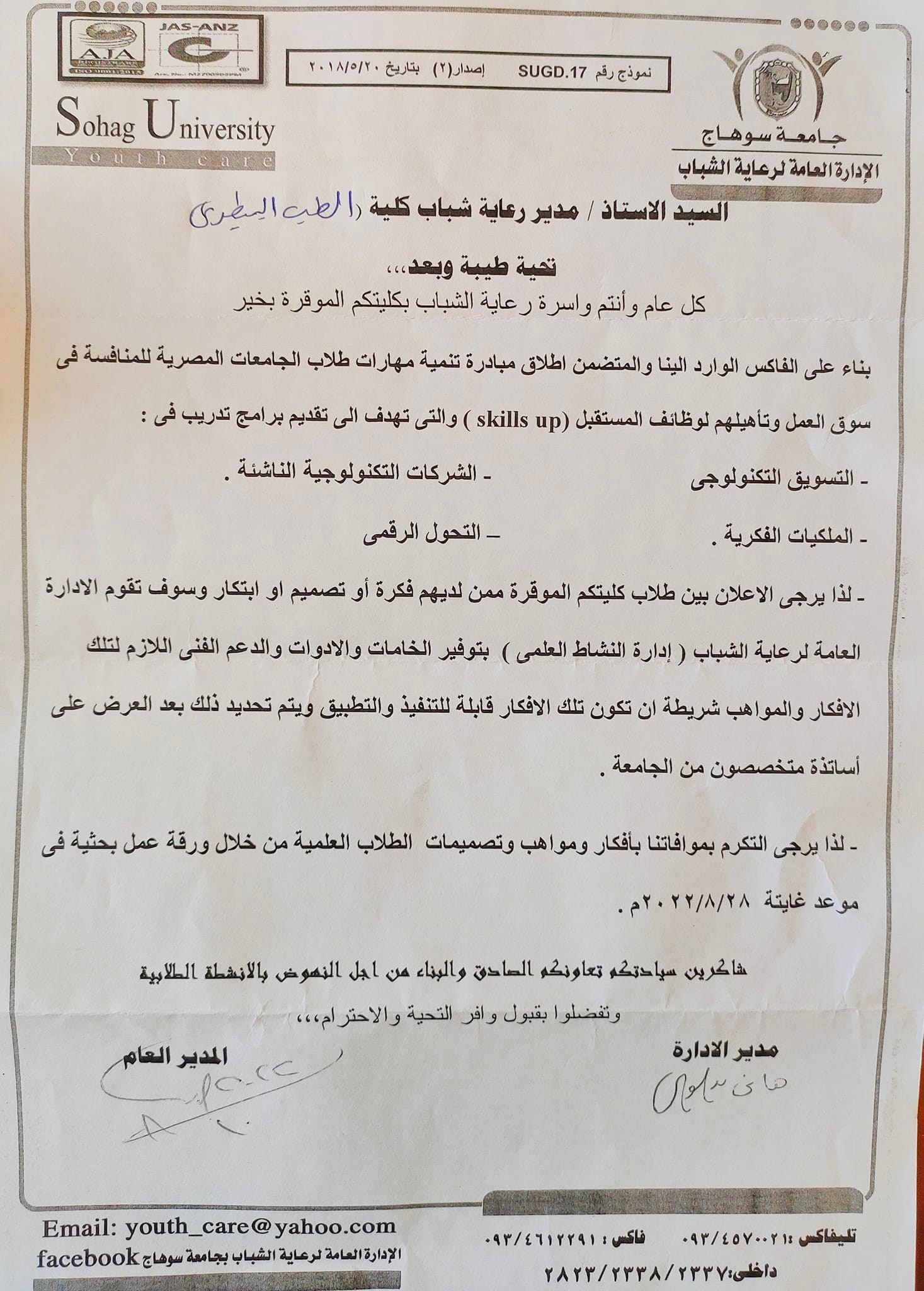 الرئيسية » مبادرة تنمية مهارات الطلاب للمنافسة فى سوق العمل وتاهيلهم لسوق العمل والتى تهدف لتقديم برامجمبادرة تنمية مهارات الطلاب للمنافسة فى سوق العمل وتاهيلهم لسوق العمل والتى تهدف لتقديم برامجبواسطة manarبناء على قيام الجامعات المصرية باطلاق مبادرة تنمية مهارات الطلاب للمنافسة فى سوق العمل وتاهيلهم لسوق العمل والتى تهدف لتقديم برامج تدريب فى 1- التسويق الاليكترونى 2- الشركات التكنولوجية الناشئة 3- الملكيات الفكرية 4- التحول الرقمى على الطلاب الراغبين في المشاركة التوجة الى ادارة رعاية الشباب شريطة ان تكون المقترحات قابلة للتنفبذ والتطبيق بعد العرض على متخصصين