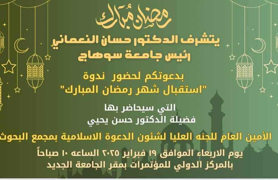 يتشرف الدكتور حسان النعماني رئيس جامعة سوهاج بدعوة سيادتكم لحضور ندوة بعنوان “استقبال شهر رمضان المبارك” و التي سيحاضر بهافضيلة الدكتور حسن يحيي الأمين العام للجنه العليا لشئون الدعوة الاسلامية بمجمع البحوث وذلك غدا. الأربعاء الموافق ١٩ فبراير ٢٠٢٥ الساعة ١٠ صباحاً بالمركز الدولي للمؤتمرات بمقر الجامعة الجديد