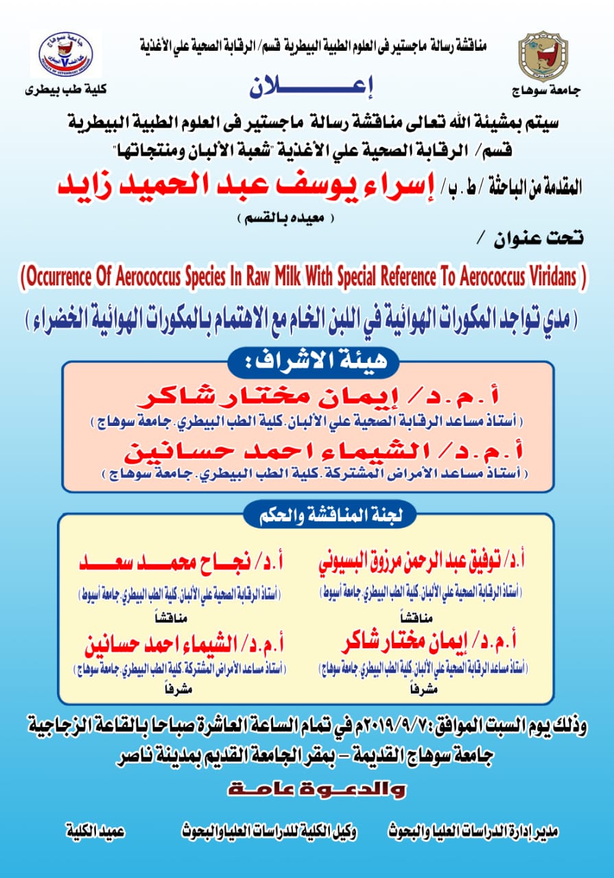 علان مناقشة رسالة ماجستير في العلوم الطبية البيطرية قسم الرقابة الصحية علي الأغذية المقدمة من الباحثة / ط. ب/ إسراء يوسف عبد الحميد زاید ( معيده بالقسم )