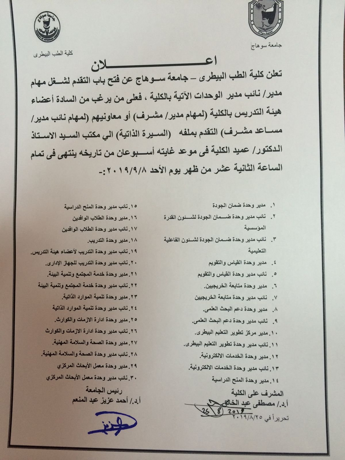 تعلن كلية الطب البيطري – جامعة سوهاج عن فتح باب التقدم لشغل مهام مدير و نائب مدير الوحدات الآتية بالكلية ، فعلى من يرغب من السادة (أعضاء هيئة التدريس بالكلية) لمهام مدير / مشرف (ومعاونيهم) لمهام نائب مدير / مساعد مشرفالتقدم بملف السيرة الذاتية الي… اقرأ المزيد »فتح باب التقدم لشغل مهام مدير و نائب مدير الوحدات الآتية بالكلية