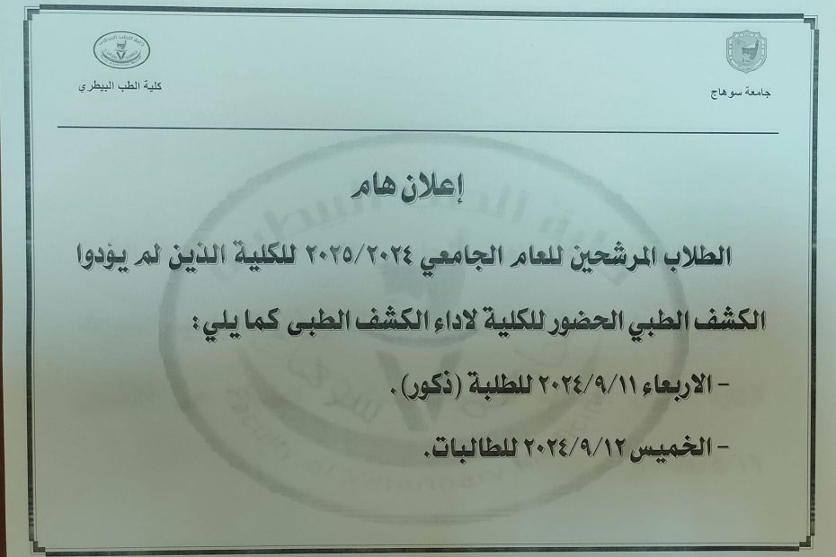 إعلان هام الطلاب المرشحين للعام الجامعى 2024/2025 للكلية مرفق أكواد التسجيل على منصة زاد كلية الطب البيطرى سوهاج لدفع
