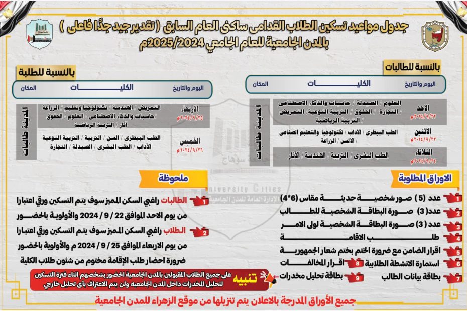 *الأحد القادم ..بدء تسكين الطلاب القدامى بمدن سوهاج الجامعية* أعلن الدكتور حسان النعماني رئيس جامعة سوهاج عن بدء تسكين الطلاب القدامى بالمدن الجامعية للعام الجامعي 2024- 2025 يوم الأحد الموافق 22 سبتمبر الجاري، حيث تمت الموافقة على قبول الطلاب القدامى ساكنى العام السابق والحاصلين على… اقرأ المزيد »*الأحد القادم ..بدء تسكين الطلاب القدامى بمدن سوهاج الجامعية* أعلن الدكتور حسان النعماني رئيس جامعة سوهاج عن بدء تسكين الطلاب القدامى بالمدن الجامعية للعام الجامعي 2024- 2025 يوم الأحد الموافق 22 سبتمبر الجاري