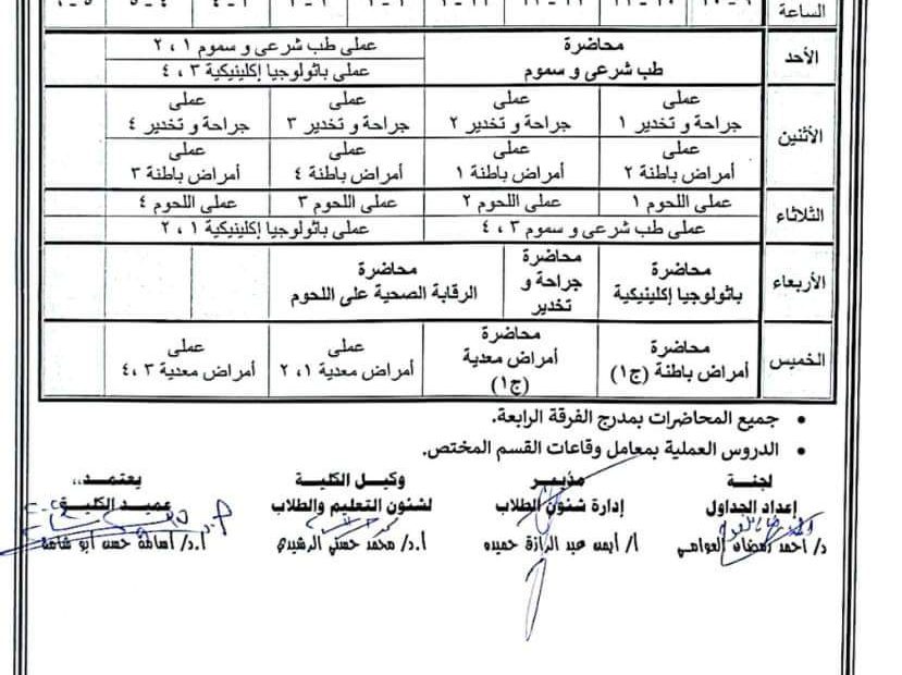 جدول الدراسي للمحاضرات و الدروس العمليه للفرق الدراسيه الخمسه للترم الأول للعام الجامعى ٢٠٢٤-٢٠٢٥
