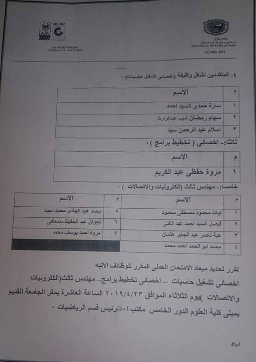 تعلن جامعة سوهاج عن تحديد موعد الامتحان العملي المقرر للوظائف الأتية ” اخصائي تشغيل حاسبات ، اخصائي تخطيط برامج، مهندس ثالث (الكترونيات والاتصالات ) ، يوم الثلاثاء الموافق 23 ابريل الجاري في تمام الساعة العاشرة صباحا بمقر الجامعة القديم بمبني كلية العلوم الدور الخامس بمكتب… اقرأ المزيد »23/4 موعد امتحان وظائف اخصائي تشغيل حاسبات، وتخطيط برامج ،ومهندس اليكترونيات.
