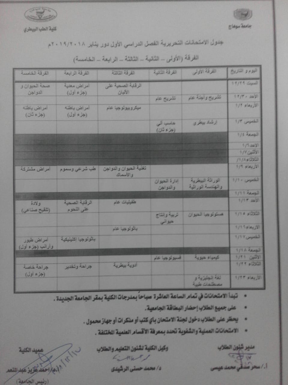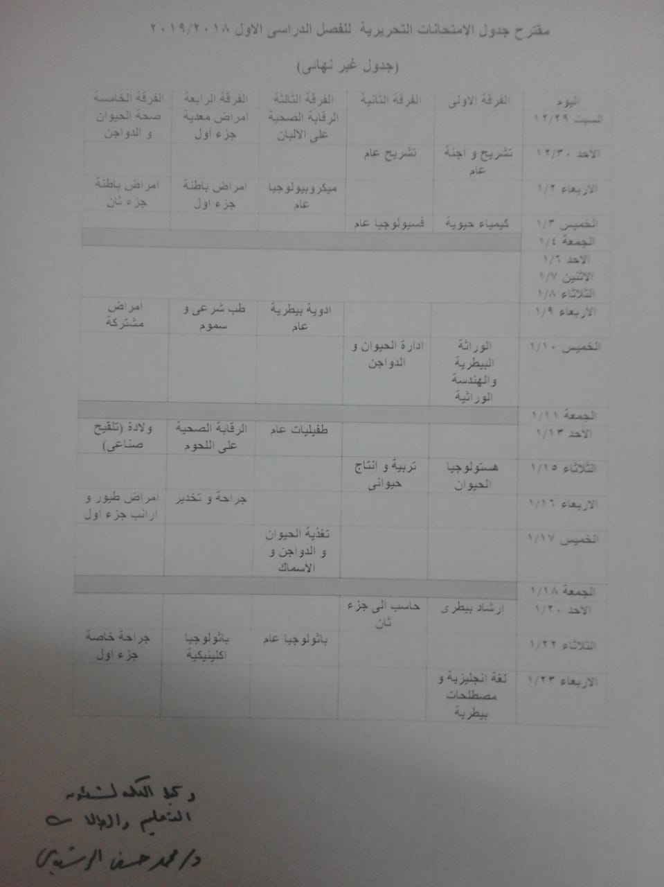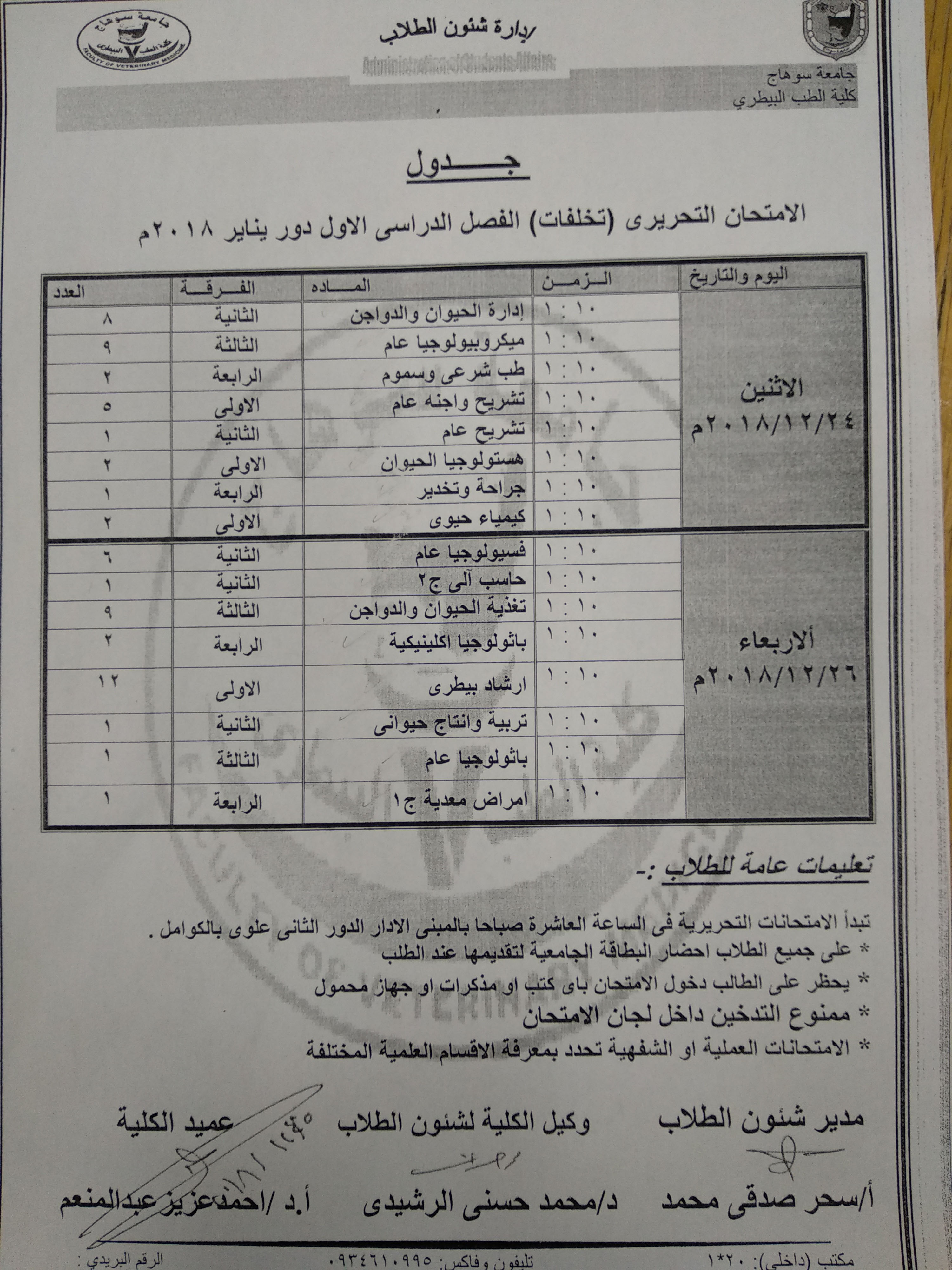 مقترح جدول الامتحانات التحريرية ( غير النهائى ) للفصل الدراسى الاول 2018/2019 يرجى مناقشة الجدول فى كل دفعة والرد فى حالة إقتراح بعض التعديلات المناسبة لوكيل الكلية لشؤن التعليم والطلاب أ.د محمد حسنى الرشيدي من خلال اتحاد الطلاب فى ميعاد أقصاه الاحد 16 / 12… اقرأ المزيد »مقترح جدول الامتحانات التحريرية ( غير النهائى ) للفصل الدراسى الاول 2018/2019