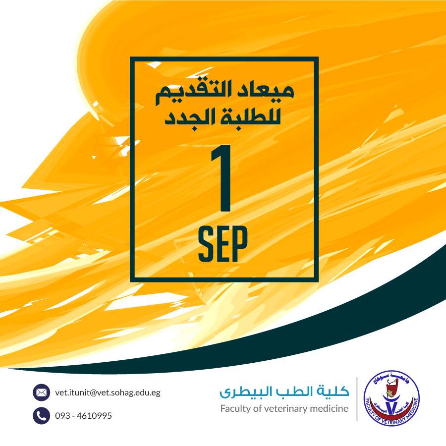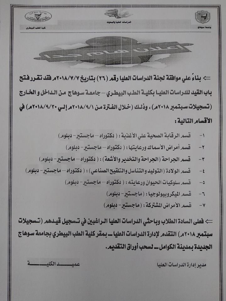 بناء على موافقة لجنة الدراسات العليا رقم (۲۲) بتاریخ ۲۰۱۸/۷/۷م فقد تقرر فتح باب القيد للدراسات العليا بكلية الطب البيطري جامعة سوهاج من الداخل و الخارج ( تسجيلات، سبتمبر ۲۰۱۸م)، وذلك خلال الفترة من ( ۲۰۱۸/۹/۱م إلى ۲۰۱۸/۹/۲۰م ) في الأقسام التالية: 1- قسم الرقابة… اقرأ المزيد »فتح باب القيد بالدراسات العليا تسجيلات سبتمبر