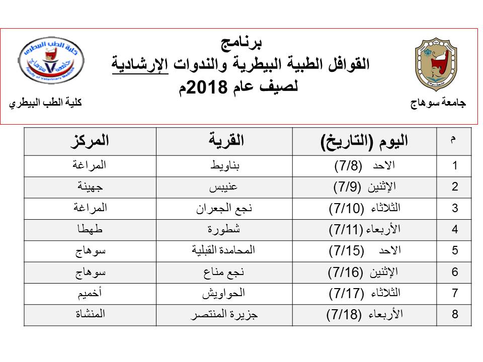 برنامج القوافل الطبية البيطرية والندوات الإرشادية لصيف عام 2018 كما هو موضح بالجدول التالى: