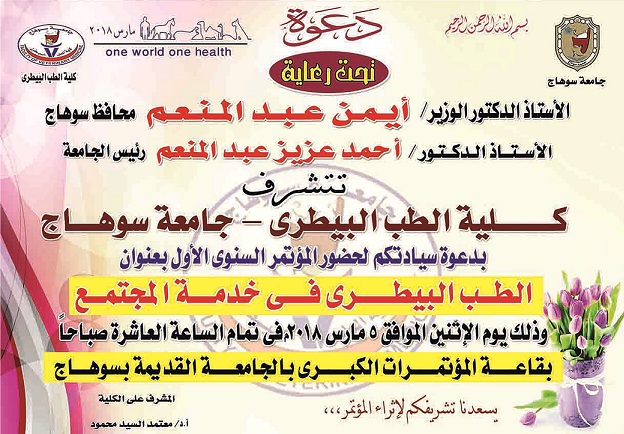 في ظل دعوة الأستاذ الدكتور/احمد عزيز رئيس الجامعة للاهتمام بالبحث العلمي وتحت رعاية سيادته والأستاذ الدكتور/معتمد السيد محمود عميد كلية الطب البيطري تنظم الكلية المؤتمر العلمي السنوي الأول بعنوان”الطب البيطري في خدمة المجتمع ” بالقاعة الكبري بالجامعة القديمة يوم الإثنين 5مارس 2018 بأطروحات علمية وعروض… اقرأ المزيد »المؤتمر العلمي الأول لكلية الطب البيطري بعنوان ” الطب البيطري في خدمة المجتمع “