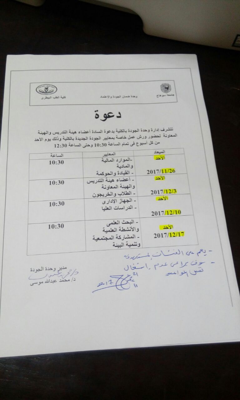 قامت وحدة ضمان الجودة والإعتماد بحضور (مدير وحدة ضمان الجودة والإعتماد) ولفيف من السادة أعضاء هيئة التدريس والهيئة المعاونة بكلا من جامعة سوهاج وجامعتى اسيوط والمنوفية ،بعقد عدد ستة (6) دورات بوحدة الجودة فى الفترة من 11/2017 حتى 7/2018 تحت العنوانين الاتية: 1.التخطيط الاستراتيجى 2.معايير الجودة بالعملية التدريسية… اقرأ المزيد »حصاد الدورات فى الترم الثانى بوحدة الجودة لسنة 2017/2018م