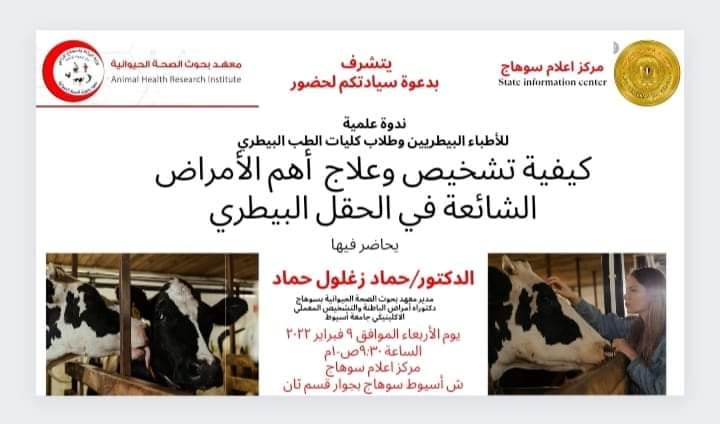 كيفية تشخيص وعلاج أهم الامراض الشائعة فى الحقل البيطرى يحاضر فيها الدكتور/حماد زعلول حماد ..مدير معهد بحوث الصحة الحيوانية بسوهاج بمركز اعلام سوهاج بجوار قسم ثانى سوهاج يوم الاربعاء9/2/2022 الساعة التاسعة والنصف صباحا