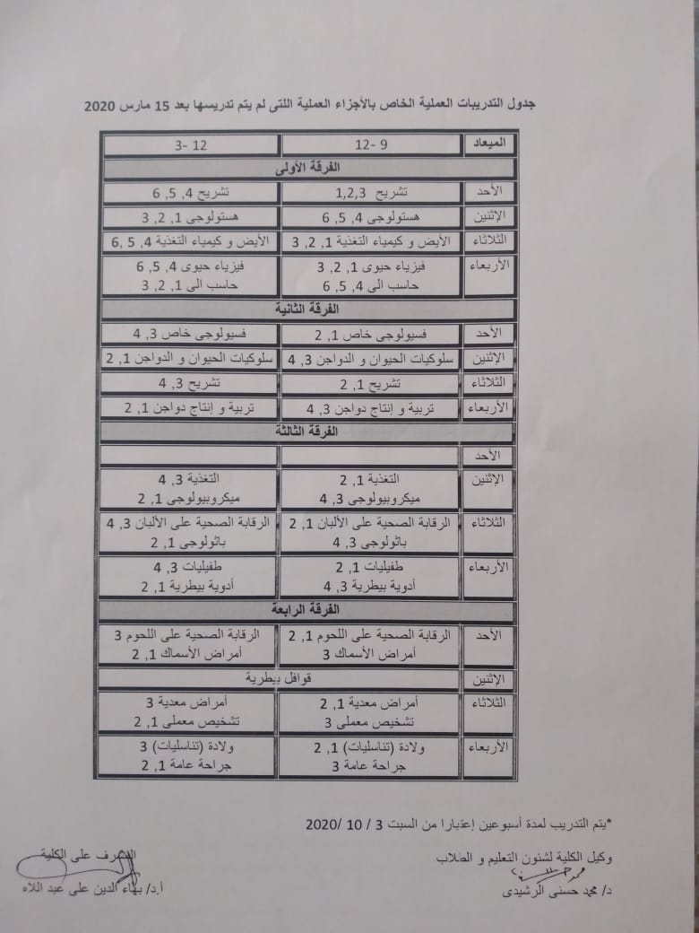 توزيع السكاشن العملية للاجزاء التى لم يتم تدريسها بعد ١٥ مارس 2020 وذلك ابتداء من يوم السبت المقبل الموافق 3/10 لمده اسبوعين