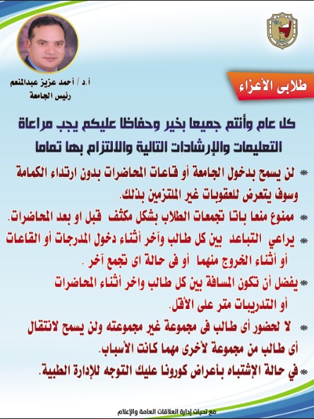 السادة أعضاء مجلس الكليه تقرر عقد مجلس الكليه لشهر أكتوبر يوم الاربعاء الموافق ٧\١٠\٢٠٢٠م الساعه الحاديه عشر صباحا بمقر الكلية بالكوامل